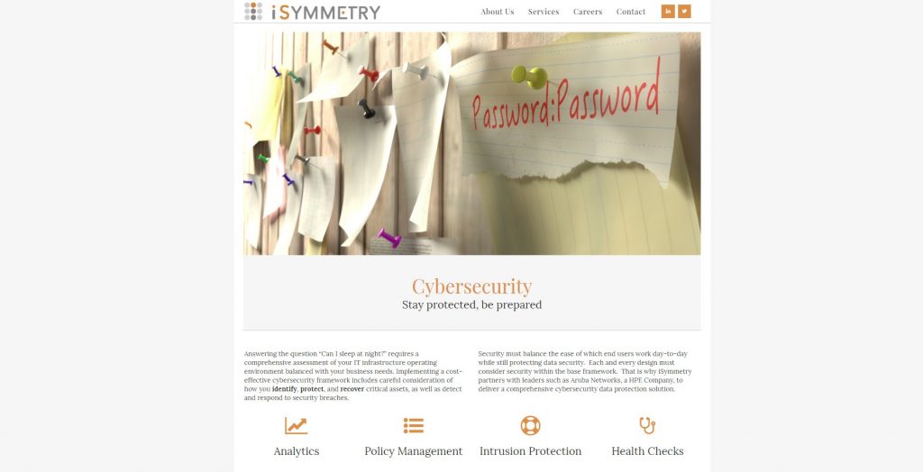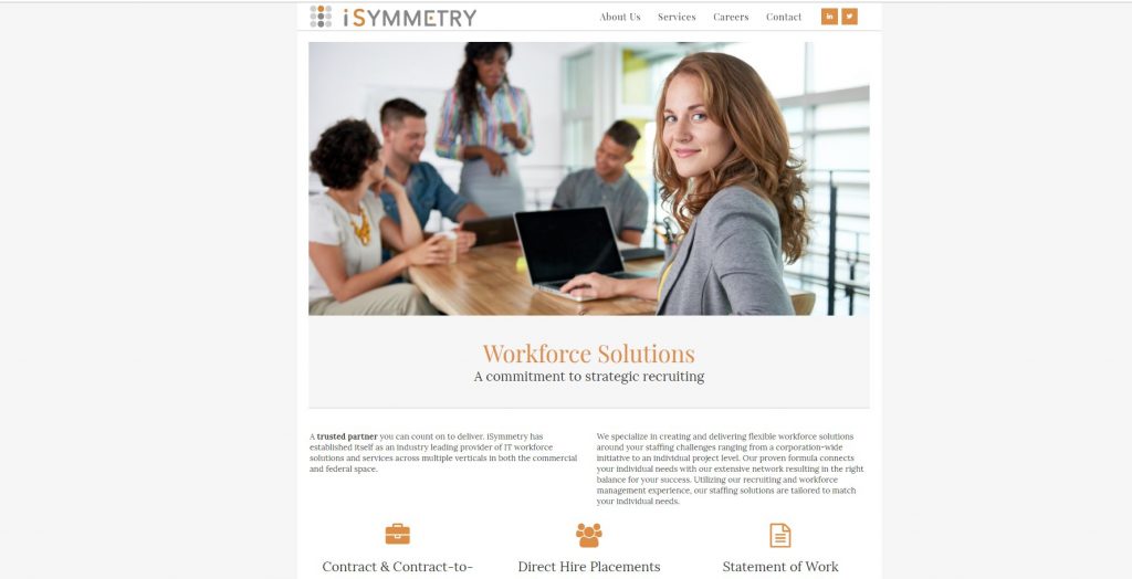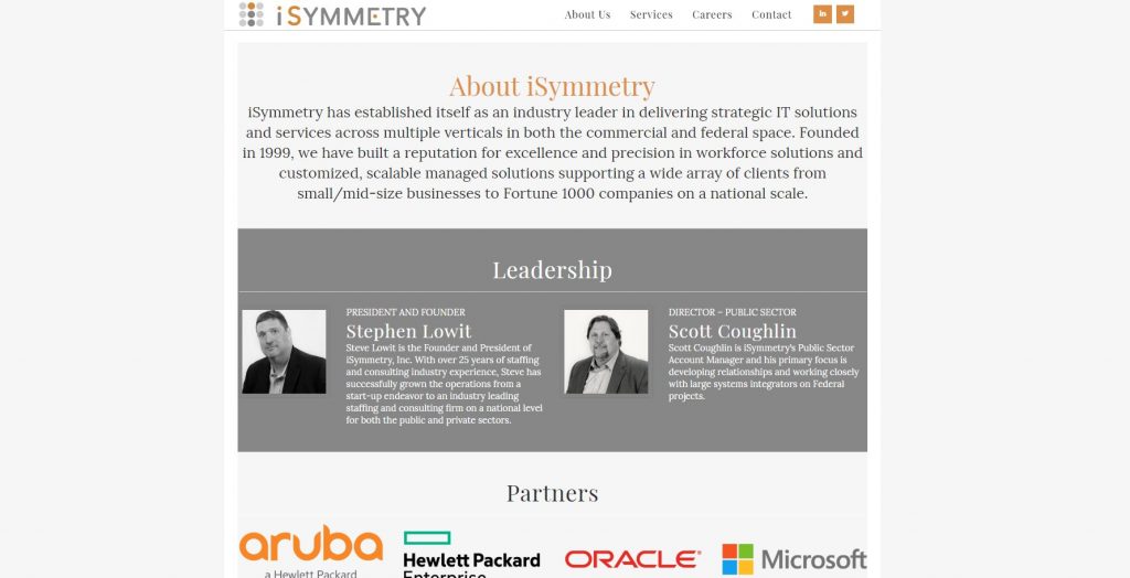 iSymmetry has established itself as an industry leader in delivering strategic IT solutions and services across multiple verticals in both the commercial and federal space. Founded in 1999, they have built a reputation for excellence and precision in workforce solutions and customized, scalable managed solutions supporting a wide array of clients from small/mid-size businesses to Fortune 1000 companies on a national scale.