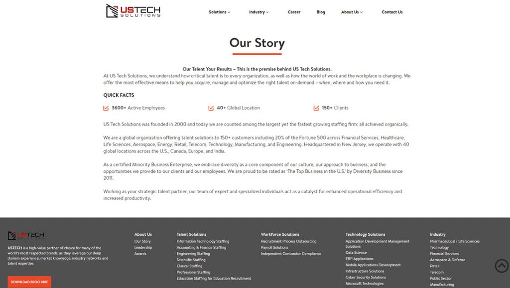 USTECH was founded in 2000 by Manoj Agarwal. Today, they are a global firm offering talent solutions to 150 customers including 20% of Fortune 500 across Financial Services, Healthcare, Life Sciences, Aerospace, Energy, Retail, Telecom, Technology, Manufacturing, and Engineering. They are headquartered in New Jersey with 40 global locations across the USA, Canada, Europe and India. As a certified Minority Business Enterprise, they embrace diversity as a core component of their culture, their approach to business and the opportunities they provide to their client and their employees. They are proud to be rated as ‘The Top Business in the U.S.’ by Diversity Business since 2011. Creosen provided support to one of their clients on a short-term project.